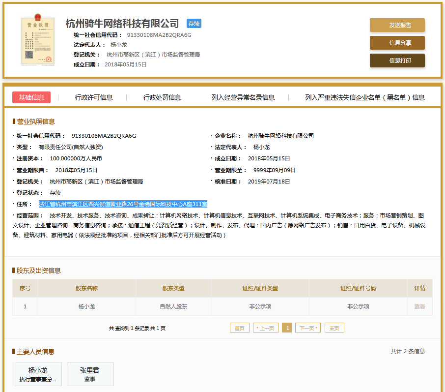 | 公司名称 | 杭州骑牛网络科技有限公司 | 信用代码 | 91330108MA2B2QRA6G |
