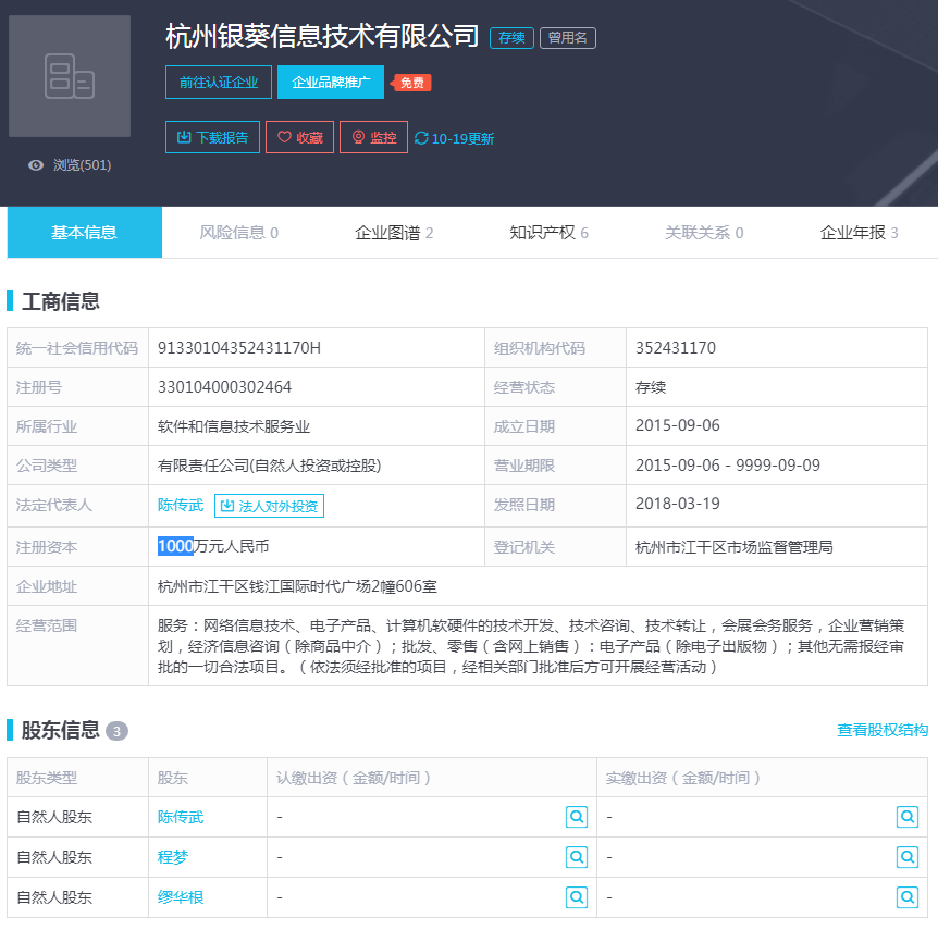 | 公司名称 | 浙江银葵信息技术有限公司 | 信用代码 | 91330104352431170H |