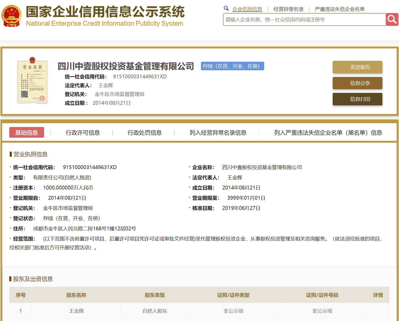 | 公司名称 | 四川中壹股权投资基金管理有限公司 | 信用代码 | 9151000031449631XD |