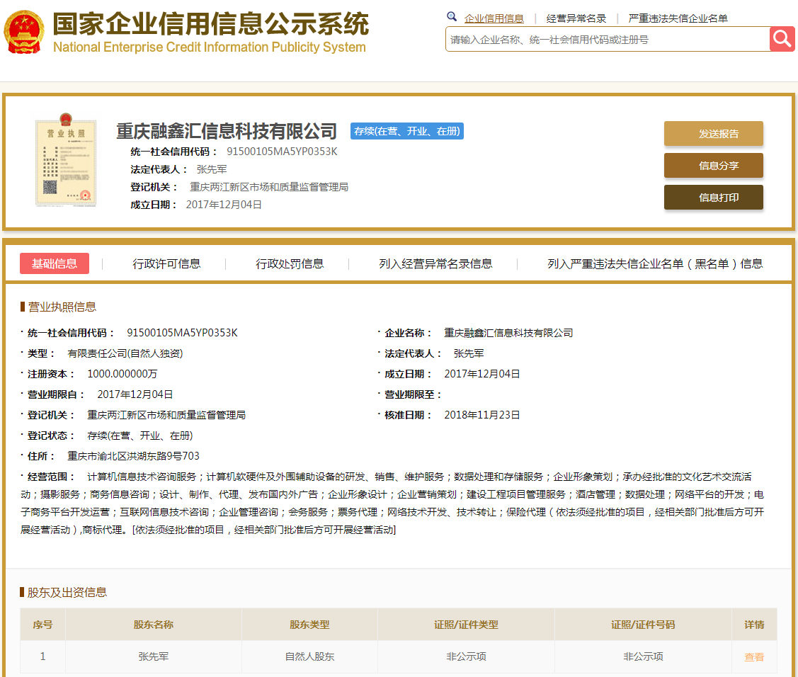 | 公司名称 | 重庆融鑫汇信息科技有限公司 | 信用代码 | 91500105MA5YP0353K |