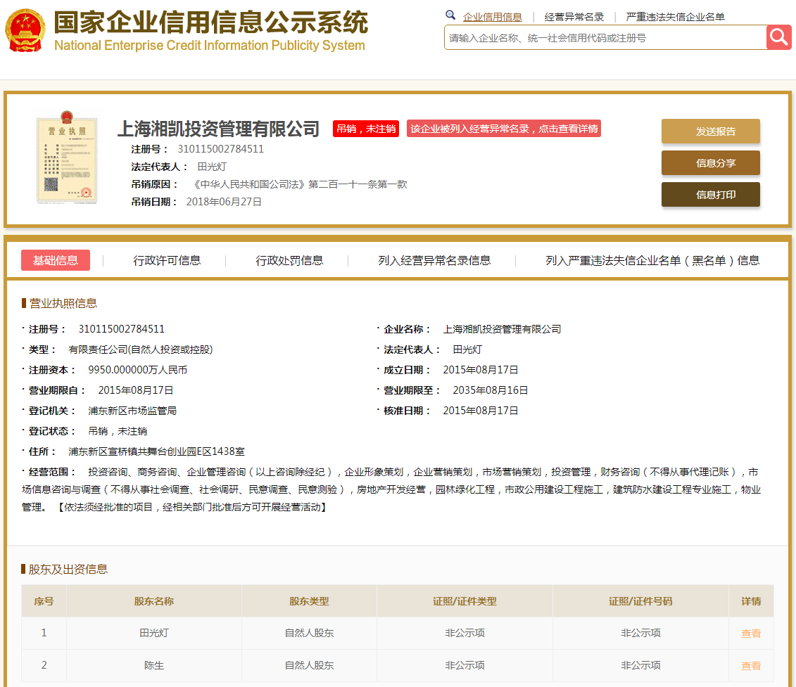 | 公司名称 | 上海湘凯投资管理有限公司 | 信用代码 | 310115002784511 |