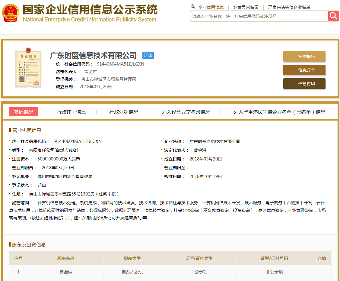 | 公司名称 | 广东时盛信息技术有限公司 | 信用代码 | 91440604MA51EJLGXN |