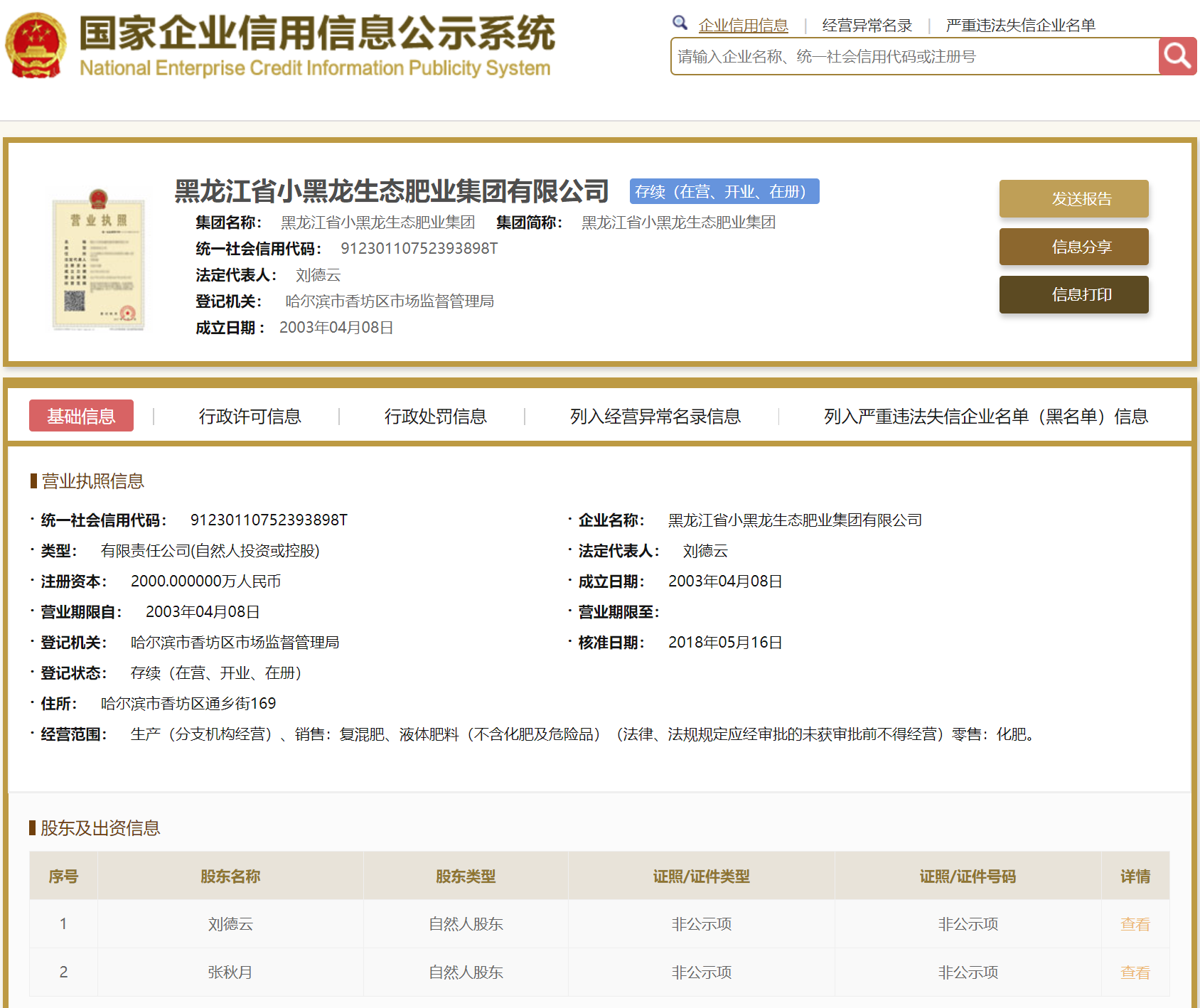 | 公司名称 | 黑龙江省小黑龙生态肥业集团有限公司 | 信用代码 | 91230110752393898T |