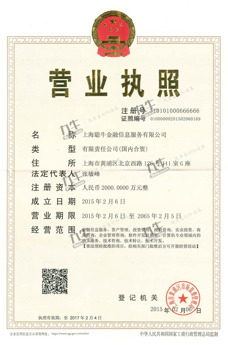| 公司名称 | 上海聪牛金融信息服务有限公司 | 信用代码 | 913101013327802189 |