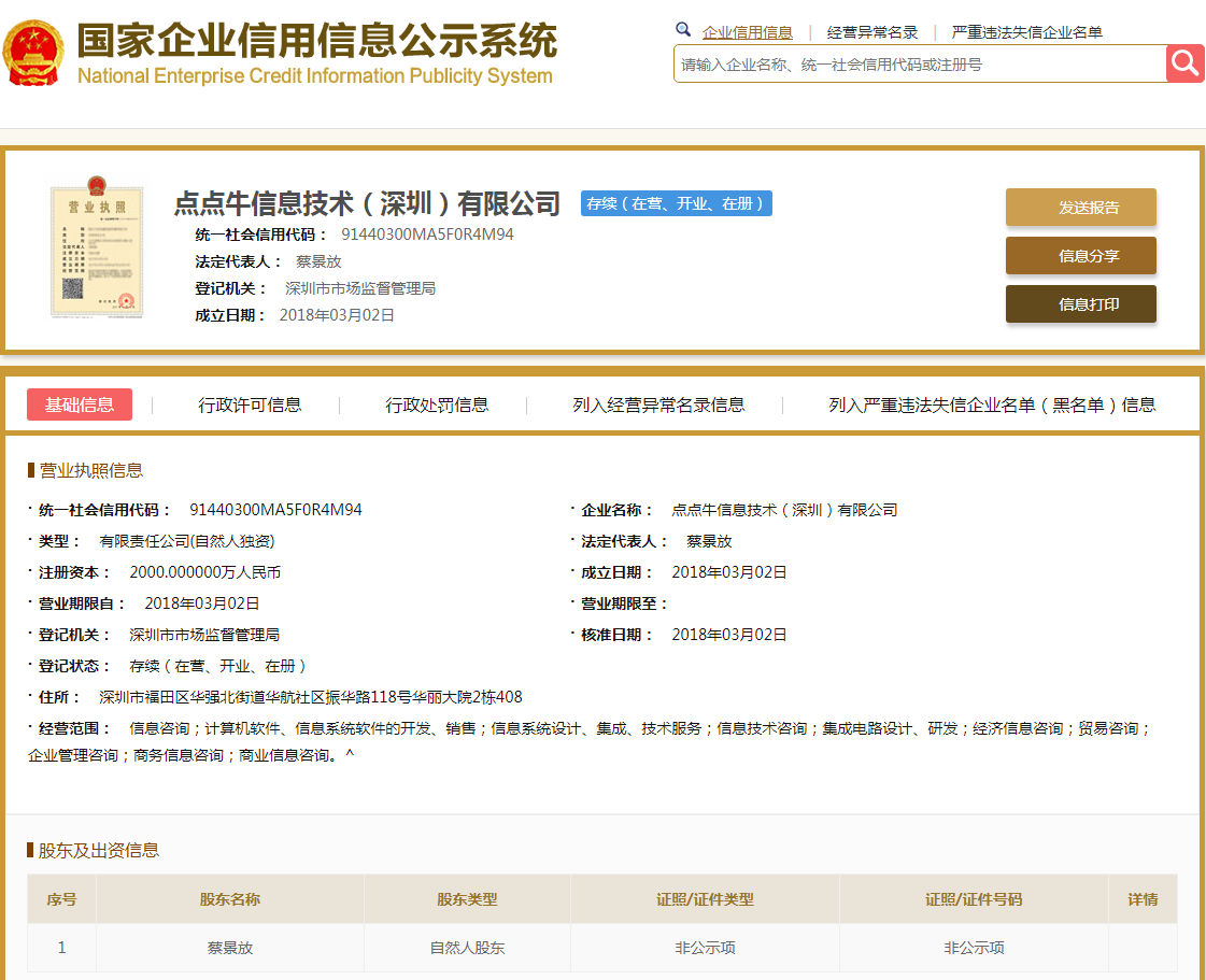 | 公司名称 | 点点牛信息技术(深圳)有限公司 | 信用代码 | 91440300MA5F0R4M94 |