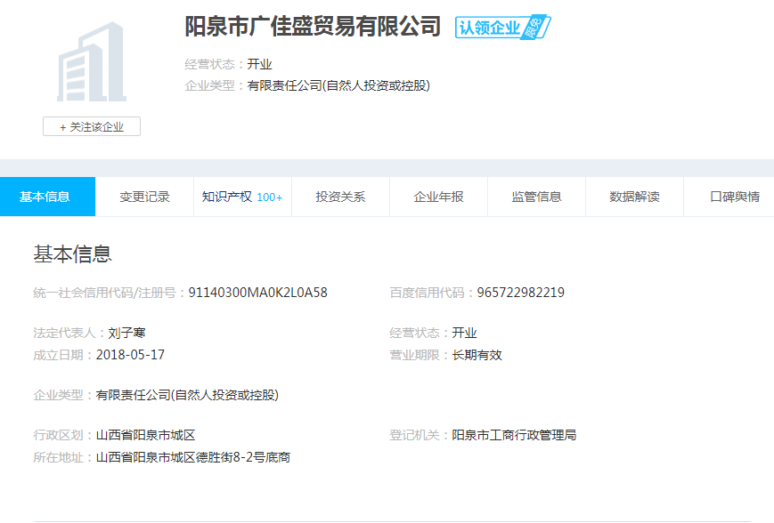 | 公司名称 | 阳泉市广佳盛贸易有限公司 | 信用代码 | 91140300MA0K2L0A58 |