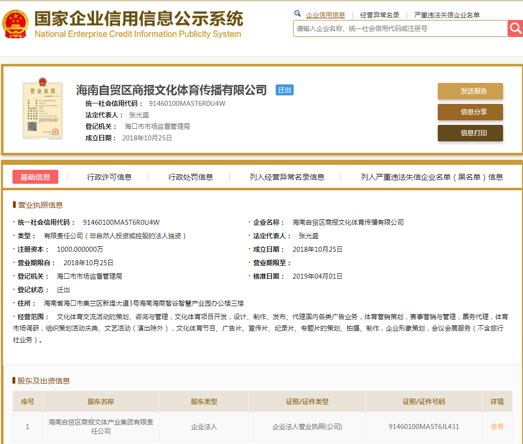 | 公司名称 | 海南自贸区商报文化体育传播有限公司 | 信用代码 | 91460100MA5T6R0U4W |
