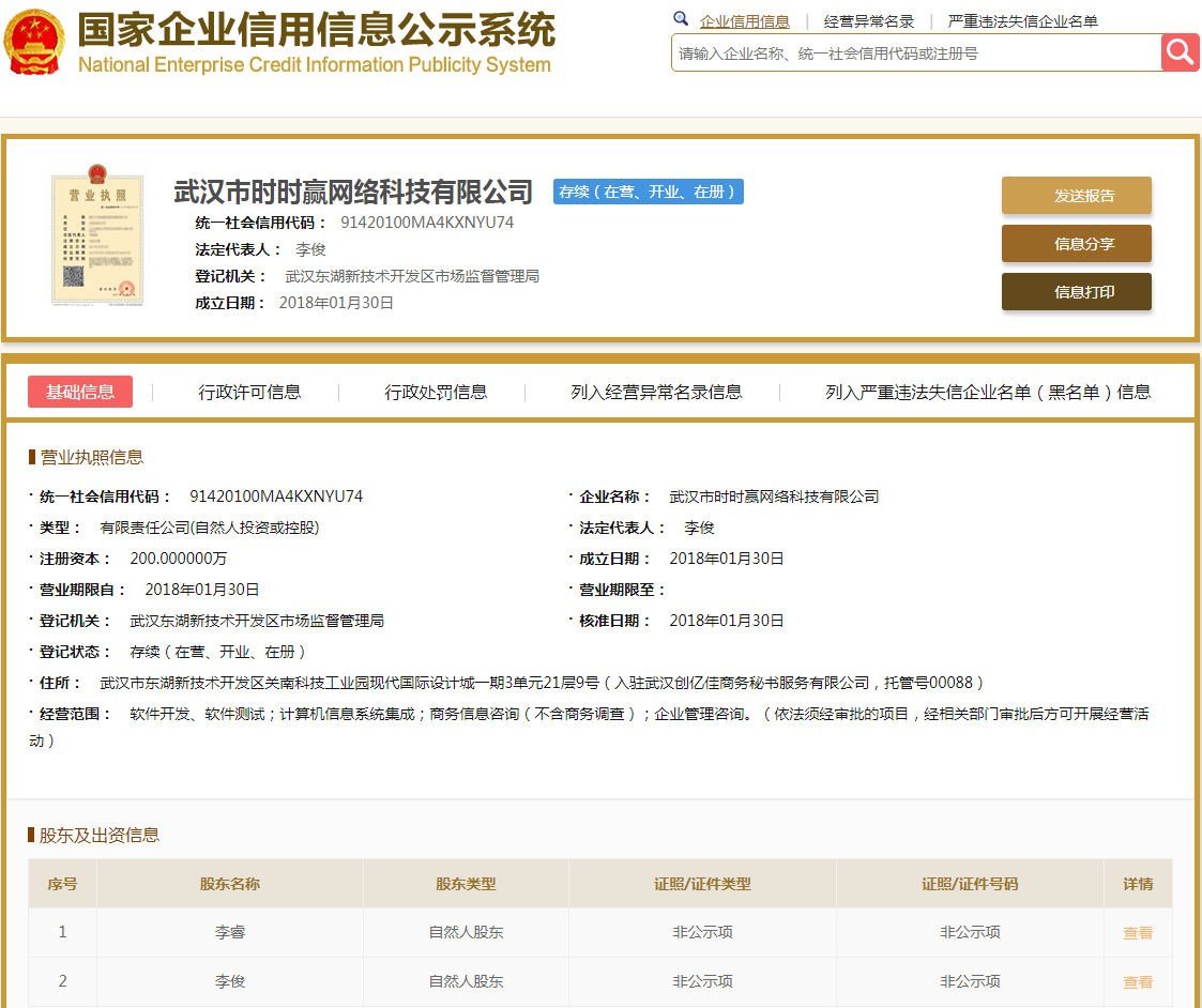 | 公司名称 | 武汉市时时赢网络科技有限公司 | 信用代码 | 91420100MA4KXNYU74 |