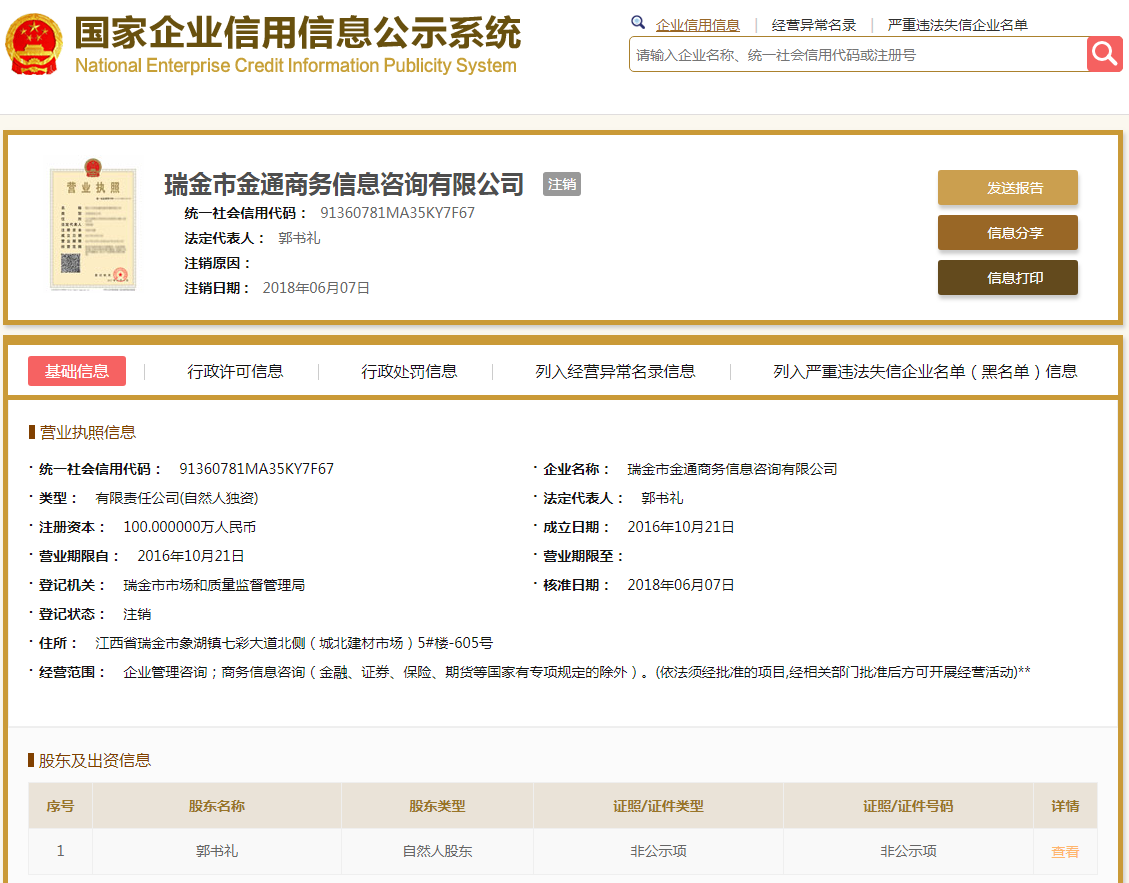 “瑞金市金通商务信息咨询有限公司”已注销。