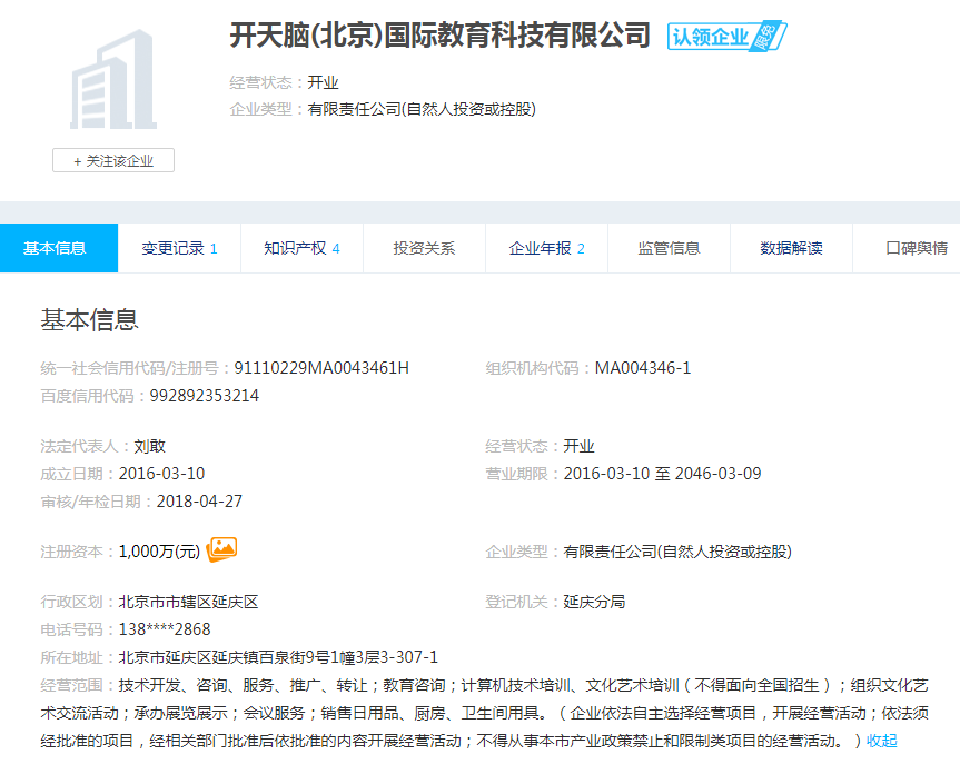 | 公司名称 | 开天脑(北京)国际教育科技有限公司 | 信用代码 | 91110229MA0043461H |