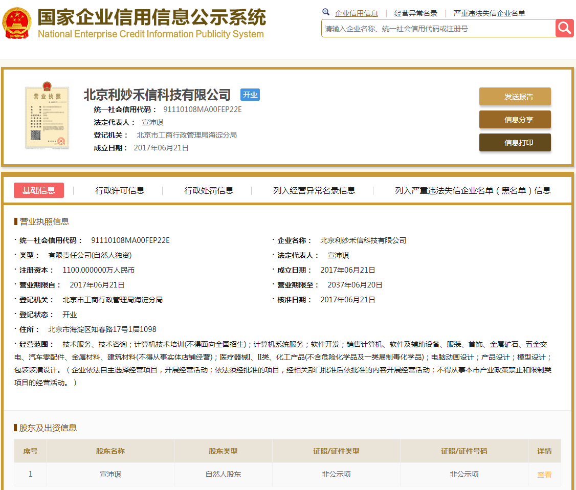 | 公司名称 | 北京利妙禾信科技有限公司 | 信用代码 | 91110108MA00FEP22E |