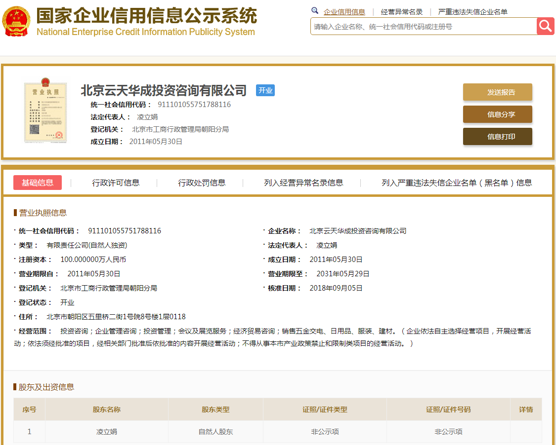 | 公司名称 | 北京云天华成投资咨询有限公司 | 信用代码 | 911101055751788116 |