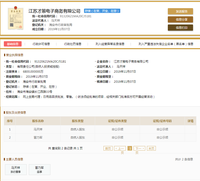 | 公司名称 | 江苏才策电子商务有限公司 | 信用代码 | 91320621MA20CJ5181 |