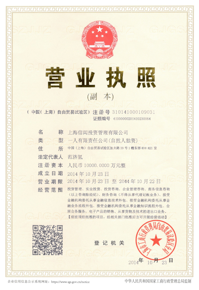 | 公司名称 | 上海信闳投资管理有限公司 | 信用代码 | 913100003207671047 |