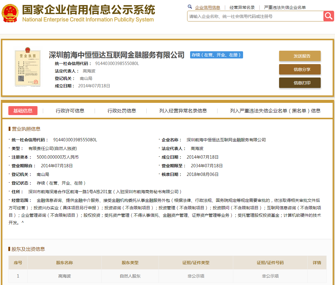 | 公司名称 | 深圳前海中恒恒达互联网金融服务有限公司 | 信用代码 | 91440300398555080L |
