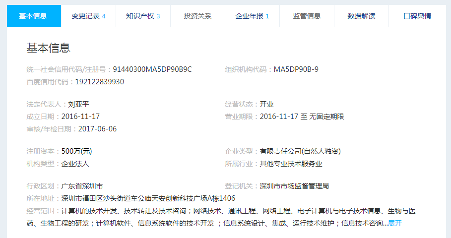 | 注册资本 | 500.00 万元 | 注册地址 | 深圳市福田区沙头街道车公庙天安创新科技广场A栋1406 |