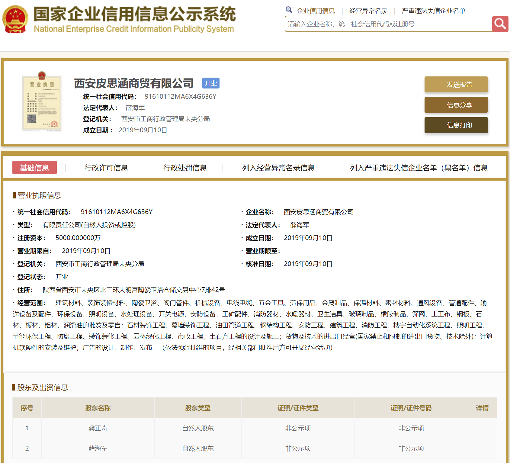 | 公司名称 | 西安皮思涵商贸有限公司 | 信用代码 | 91610112MA6X4G636Y |