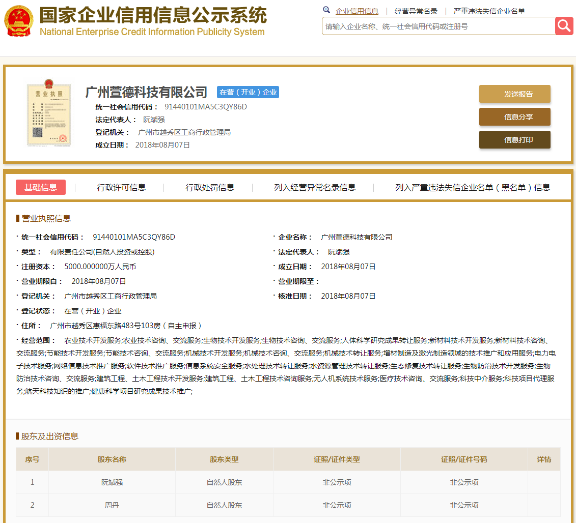 | 注册资本 | 5000.00 万元 | 注册地址 | 广州市越秀区惠福东路483号103房(自主申报) |