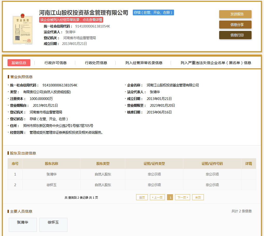 | 公司名称 | 河南江山股权投资基金管理有限公司 | 信用代码 | 91410000061381054K |