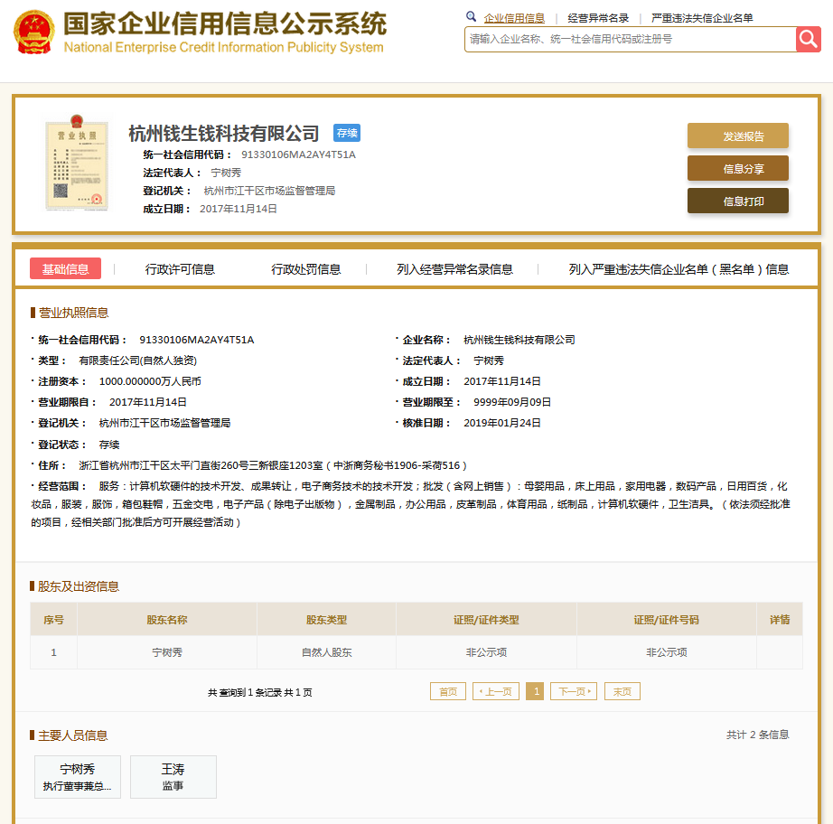 | 公司名称 | 杭州钱生钱科技有限公司 | 信用代码 | 91330106MA2AY4T51A |