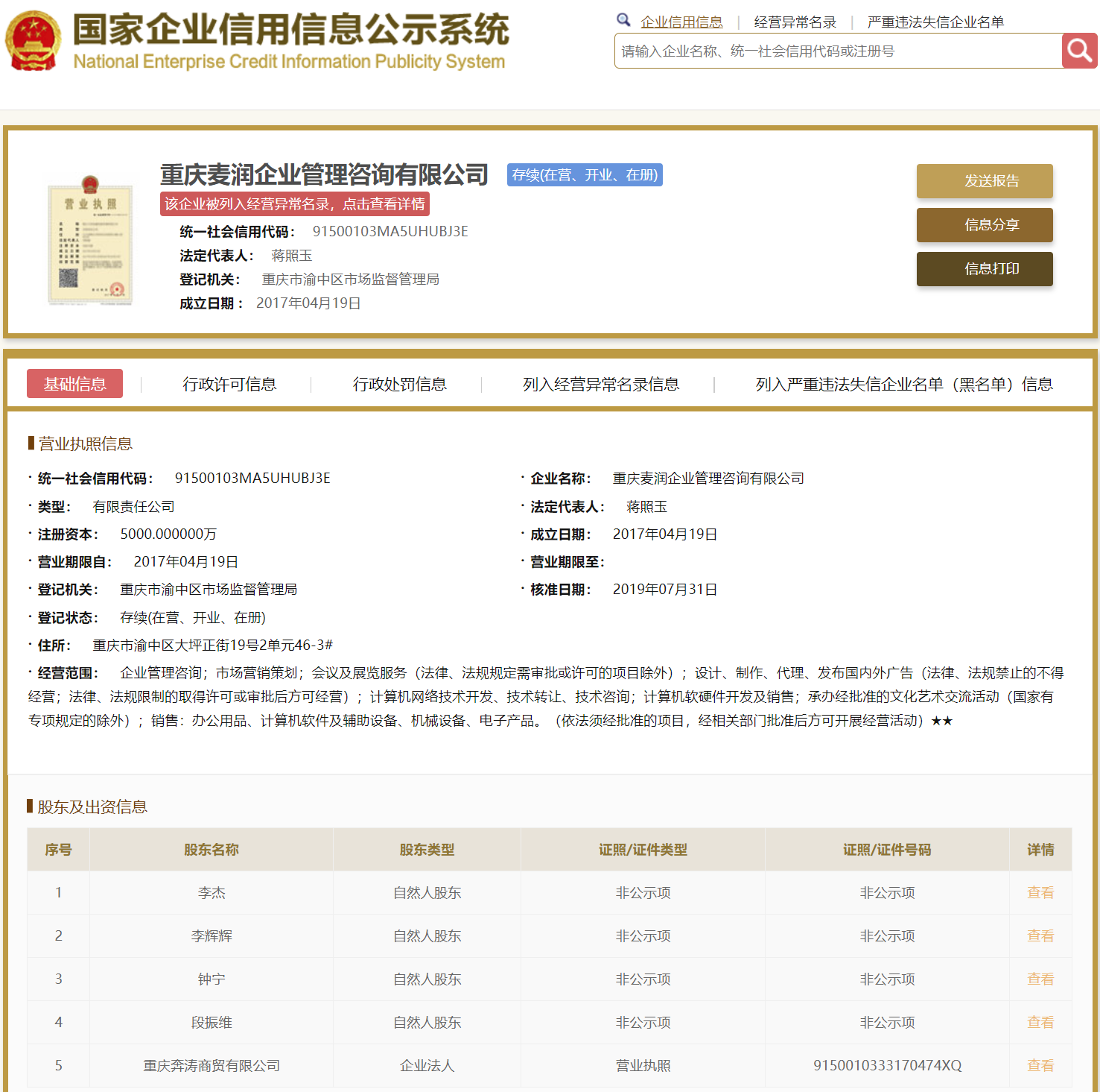 | 公司名称 | 重庆麦润企业咨询管理有限公司 | 信用代码 | 91500103MA5UHUBJ3E |