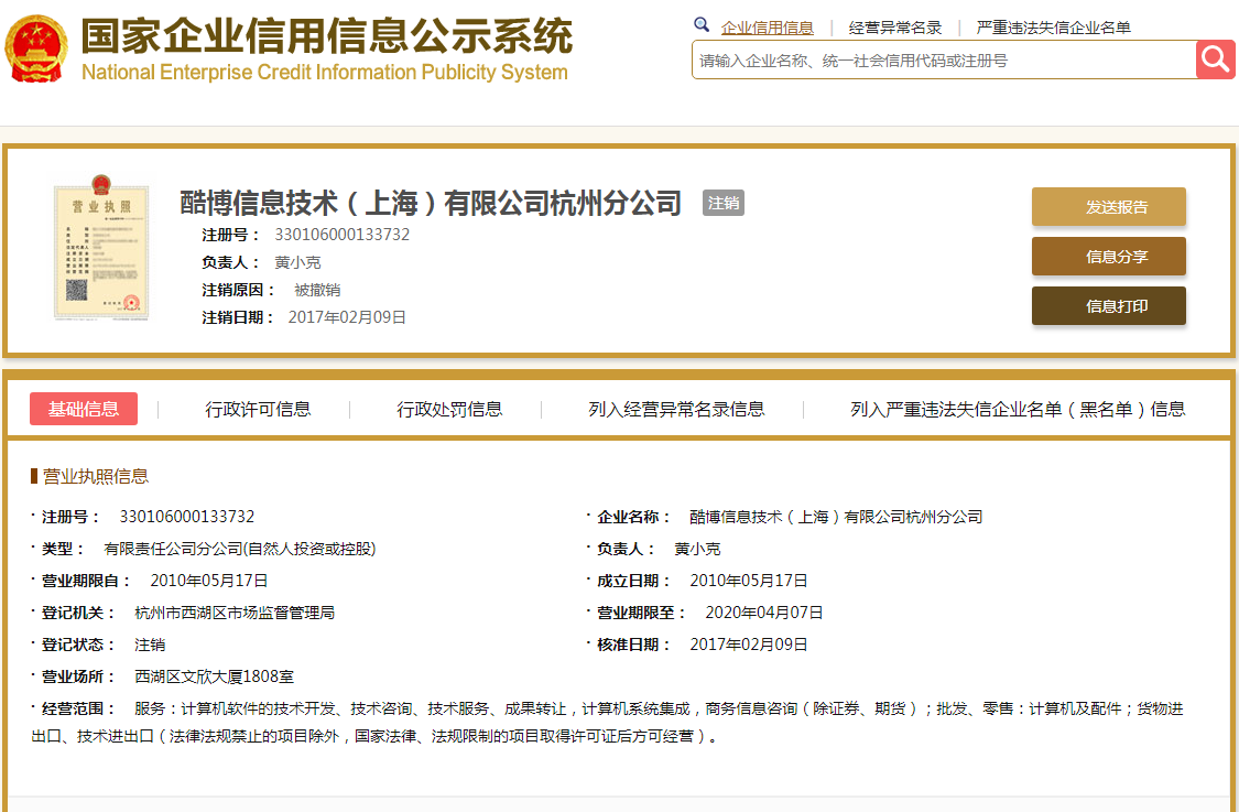 | 公司名称 | 酷博信息技术(上海)有限公司杭州分公司 | 信用代码 | 330106000133732 |