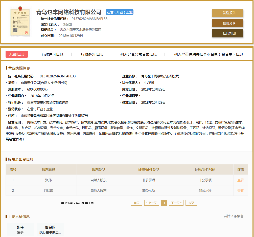 | 公司名称 | 青岛乜丰网络科技有限公司 | 信用代码 | 91370282MA3NFAPL33 |