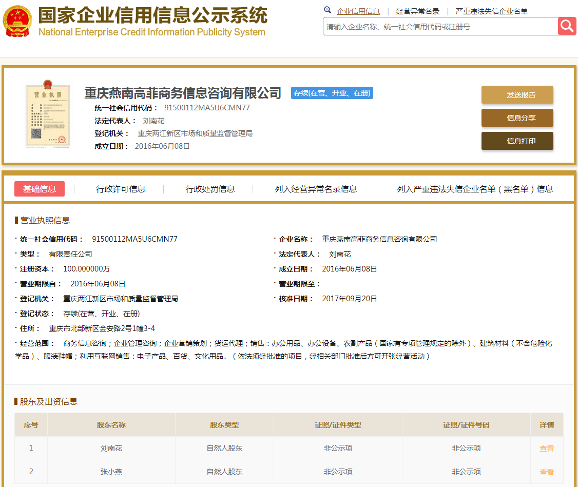 | 公司名称 | 重庆燕南高菲商务信息咨询有限公司 | 信用代码 | 91500112MA5U6CMN77 |