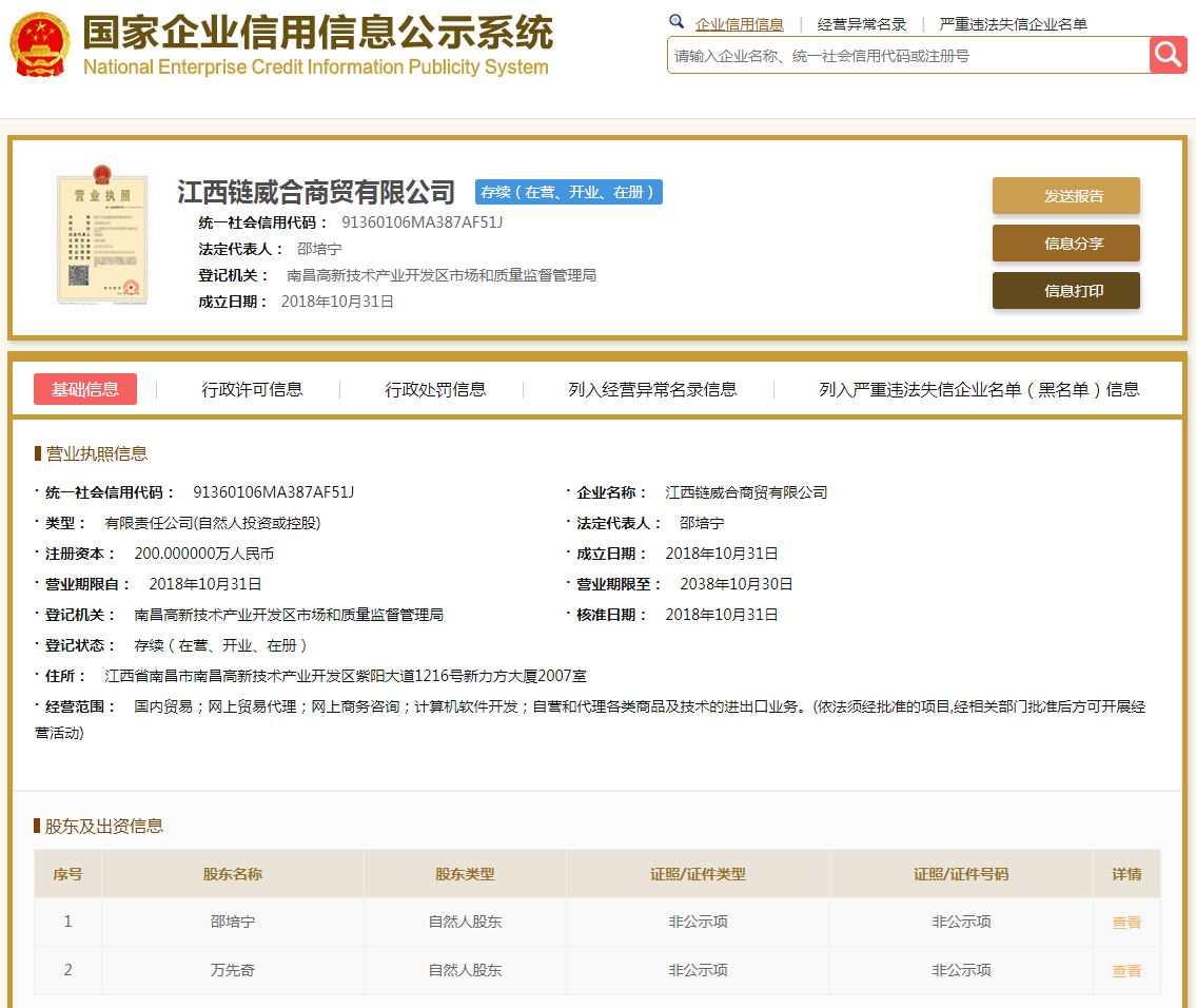 | 公司名称 | 江西链威合商贸有限公司 | 信用代码 | 91360106MA387AF51J |
