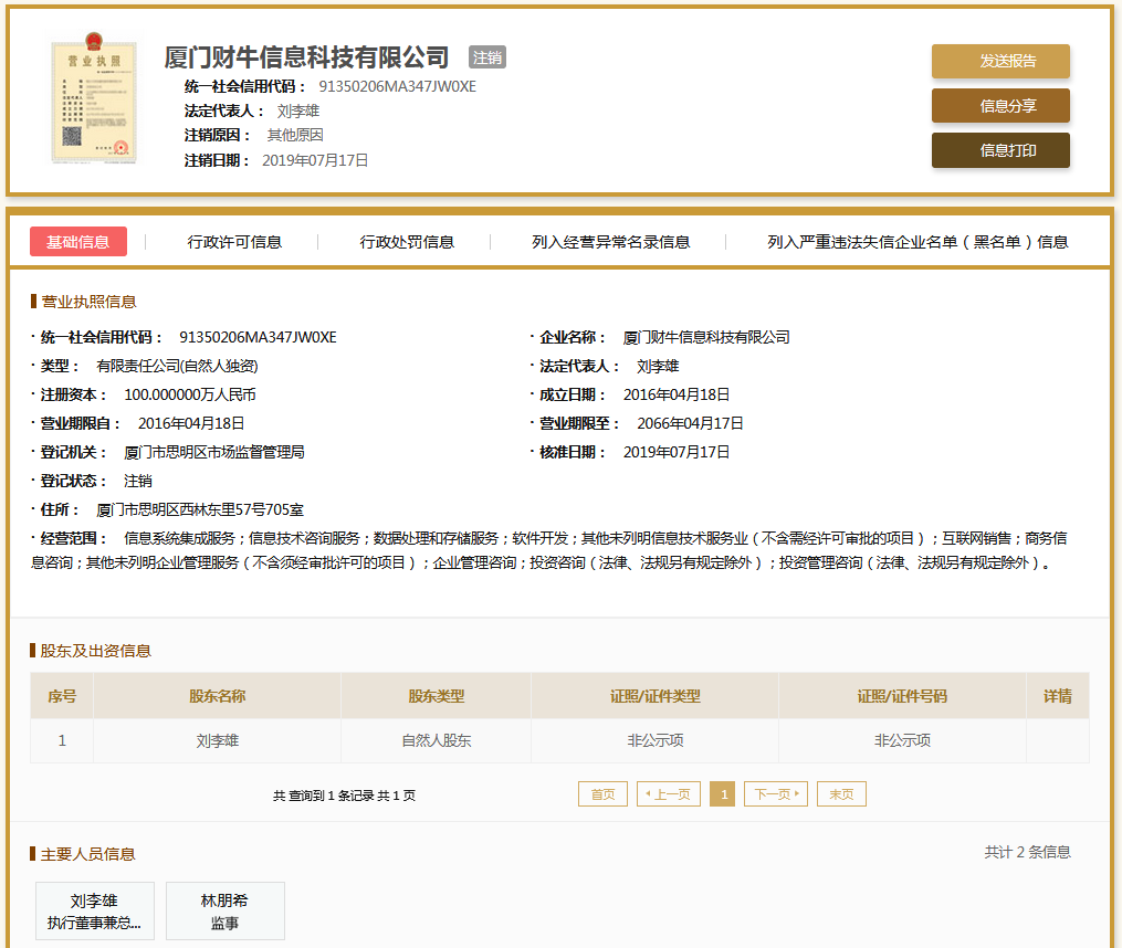 | 公司名称 | 厦门财牛信息科技有限公司 | 信用代码 | 91350206MA347JW0XE |