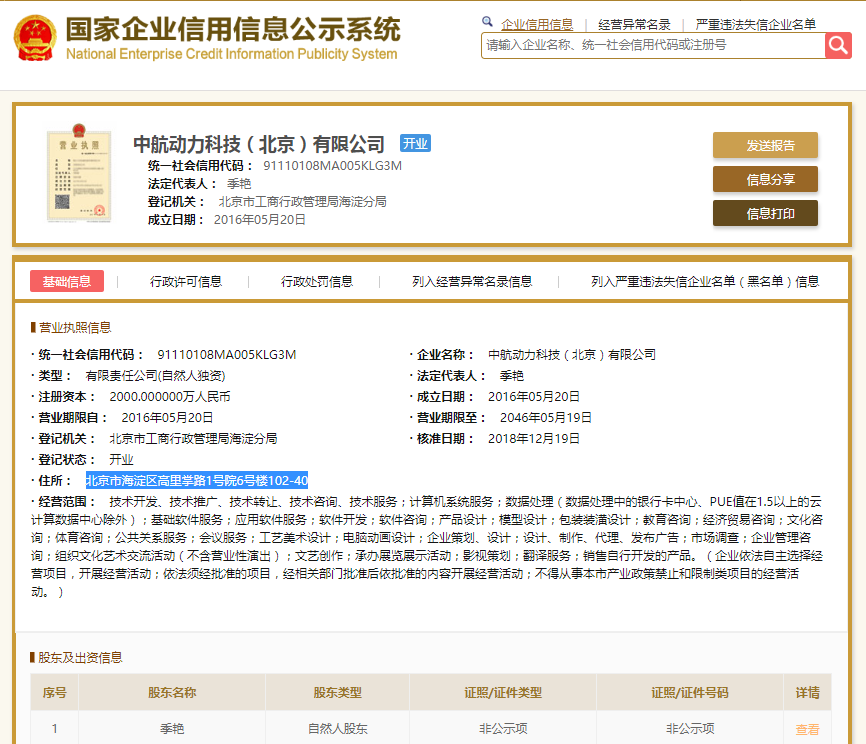 | 公司名称 | 中航动力科技(北京)有限公司 | 信用代码 | 91110108MA005KLG3M |