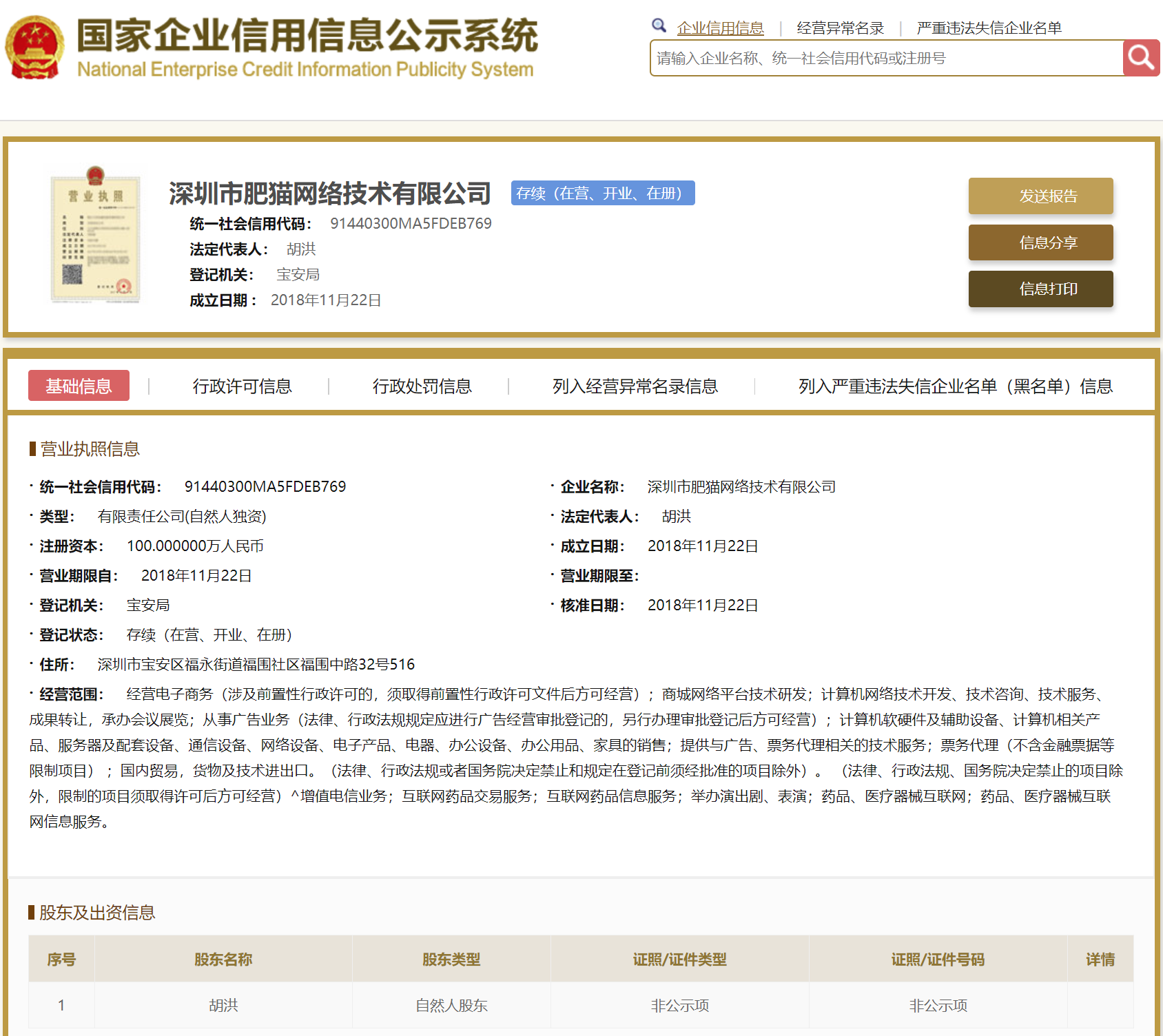 | 公司名称 | 深圳市肥猫网络技术有限公司 | 信用代码 | 91440300MA5FDEB769 |