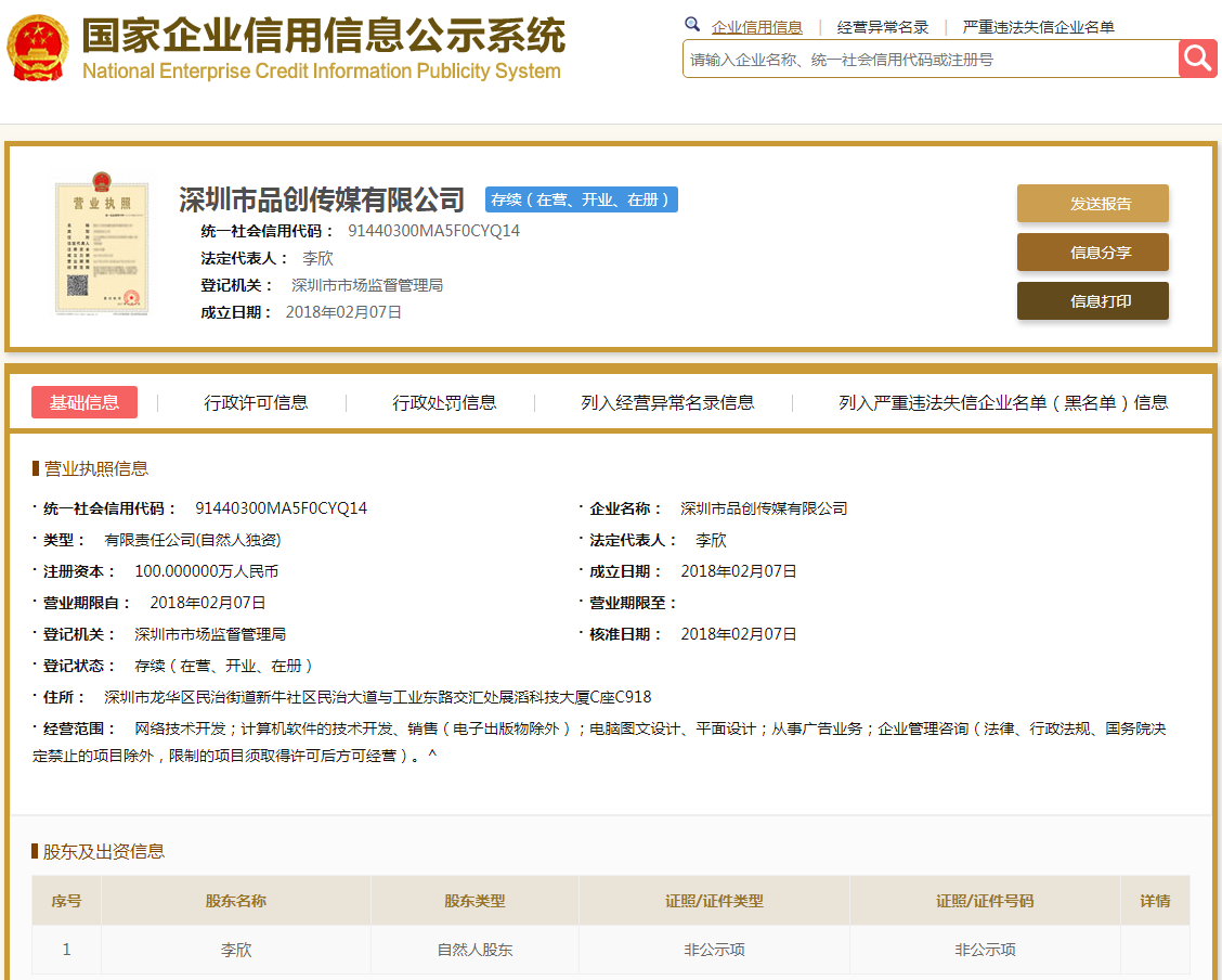 | 公司名称 | 深圳市品创传媒有限公司 | 信用代码 | 91440300MA5F0CYQ14 |