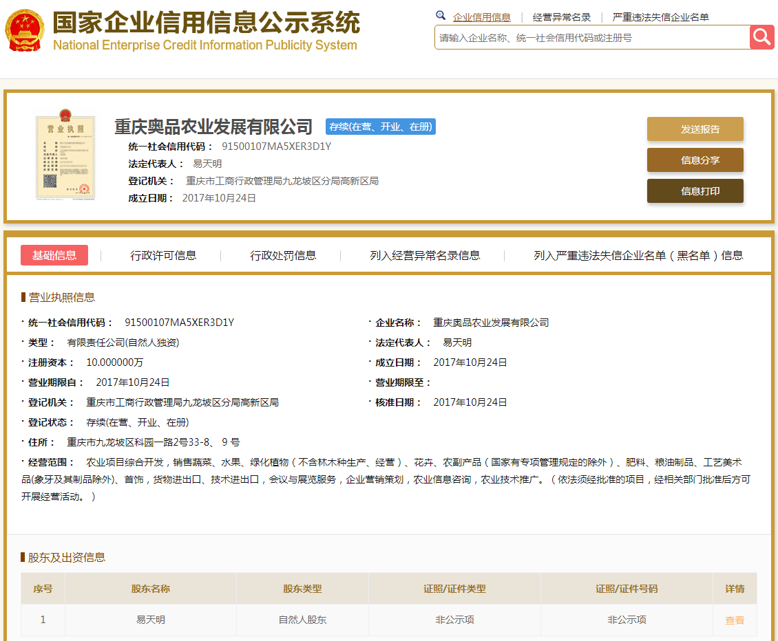 | 公司名称 | 重庆奥品农业发展有限公司 | 信用代码 | 91500107MA5XER3D1Y |