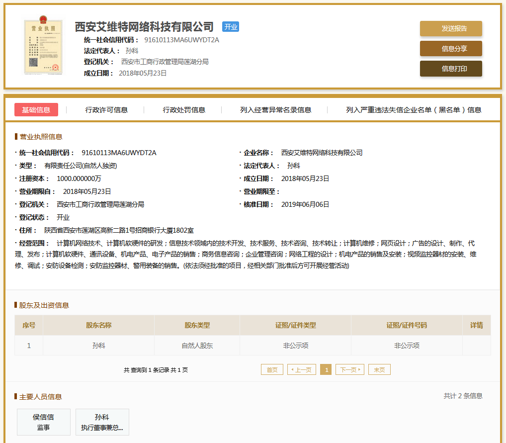 | 公司名称 | 西安艾维特网络科技有限公司 | 信用代码 | 91610113MA6UWYDT2A |