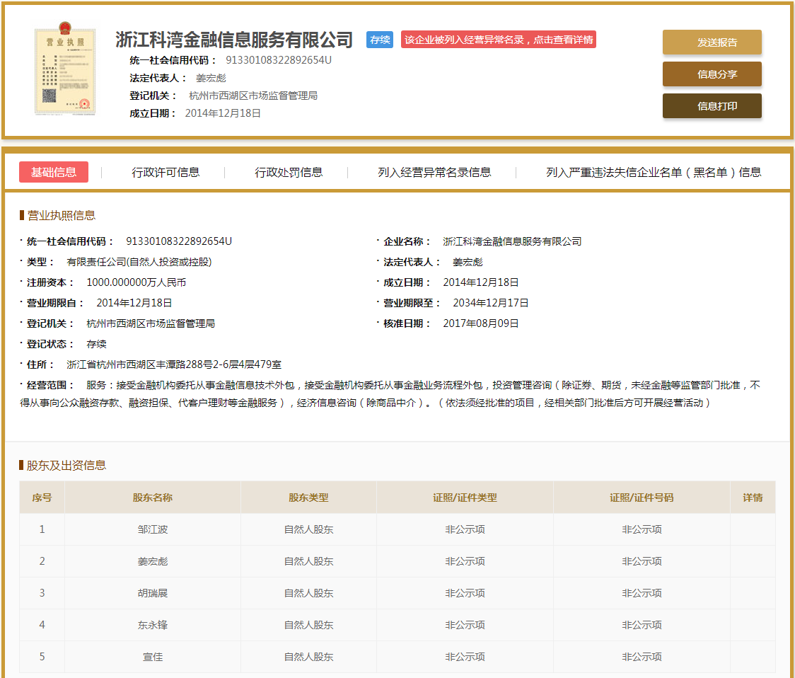 | 公司名称 | 浙江科湾金融信息服务有限公司 | 信用代码 | 91330108322892654U |