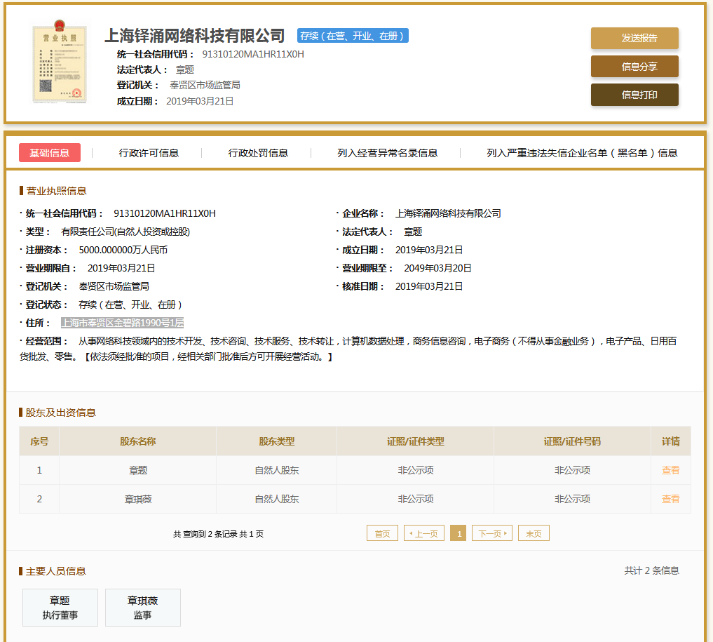 | 公司名称 | 上海铎涌网络科技有限公司 | 信用代码 | 91310120MA1HR11X0H |