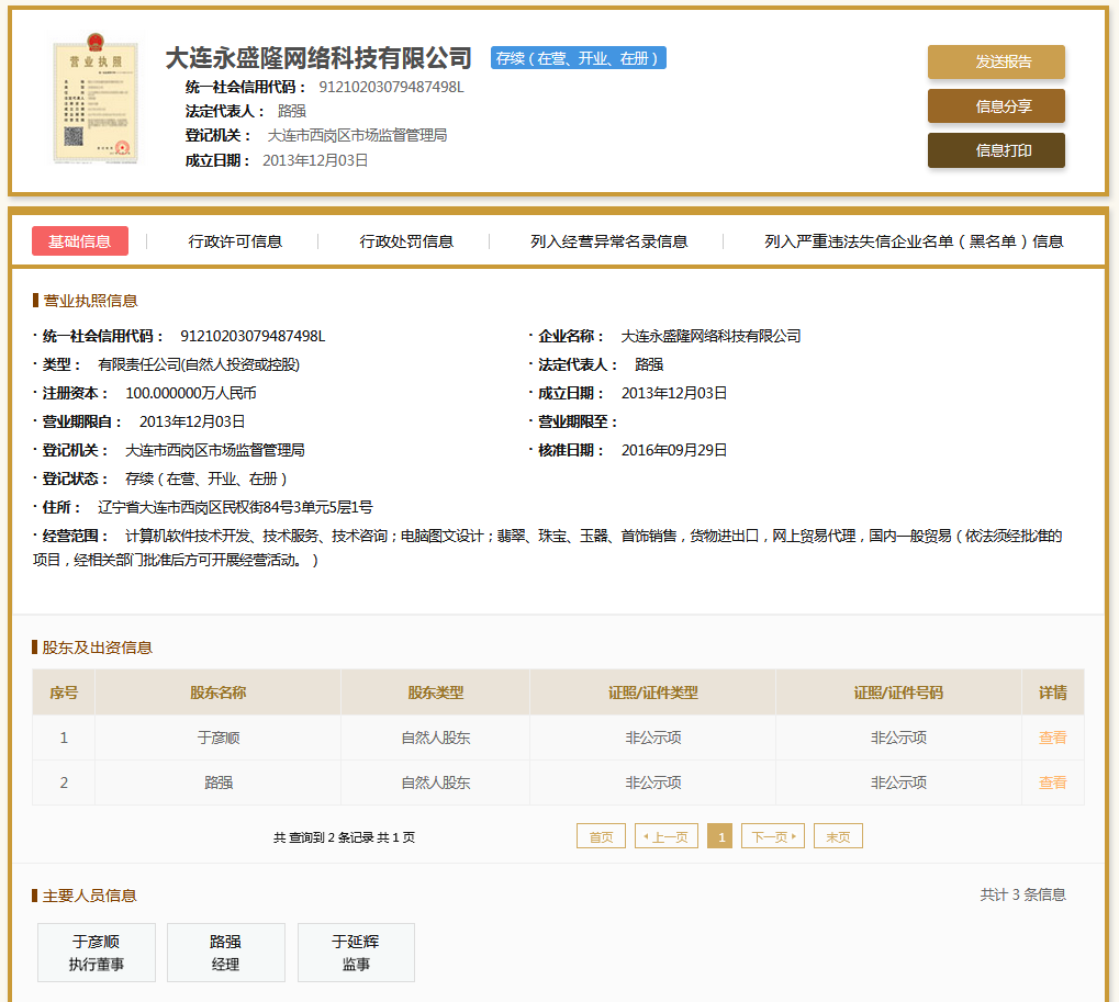 | 公司名称 | 大连永盛隆网络科技有限公司 | 信用代码 | 91210203079487498L |
