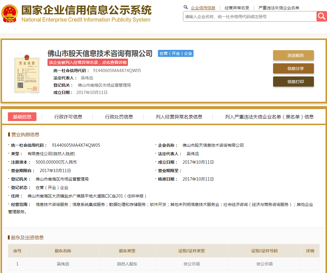 | 公司名称 | 佛山市股天信息技术咨询有限公司 | 信用代码 | 91440605MA4X74QW05 |