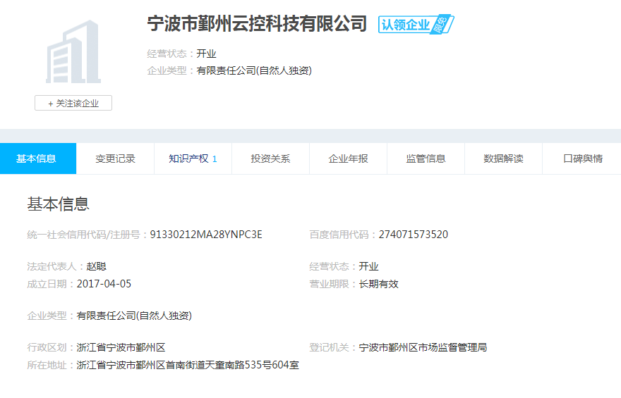 | 公司名称 | 宁波市鄞州云控科技有限公司 | 信用代码 | 91330212MA28YNPC3E |