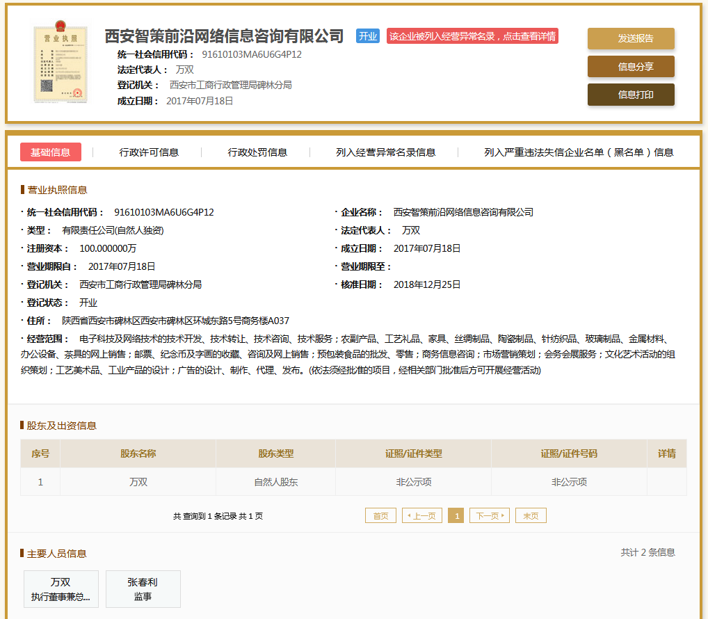 | 公司名称 | 西安智策前沿网络信息咨询有限公司 | 信用代码 | 91610103MA6U6G4P12 |