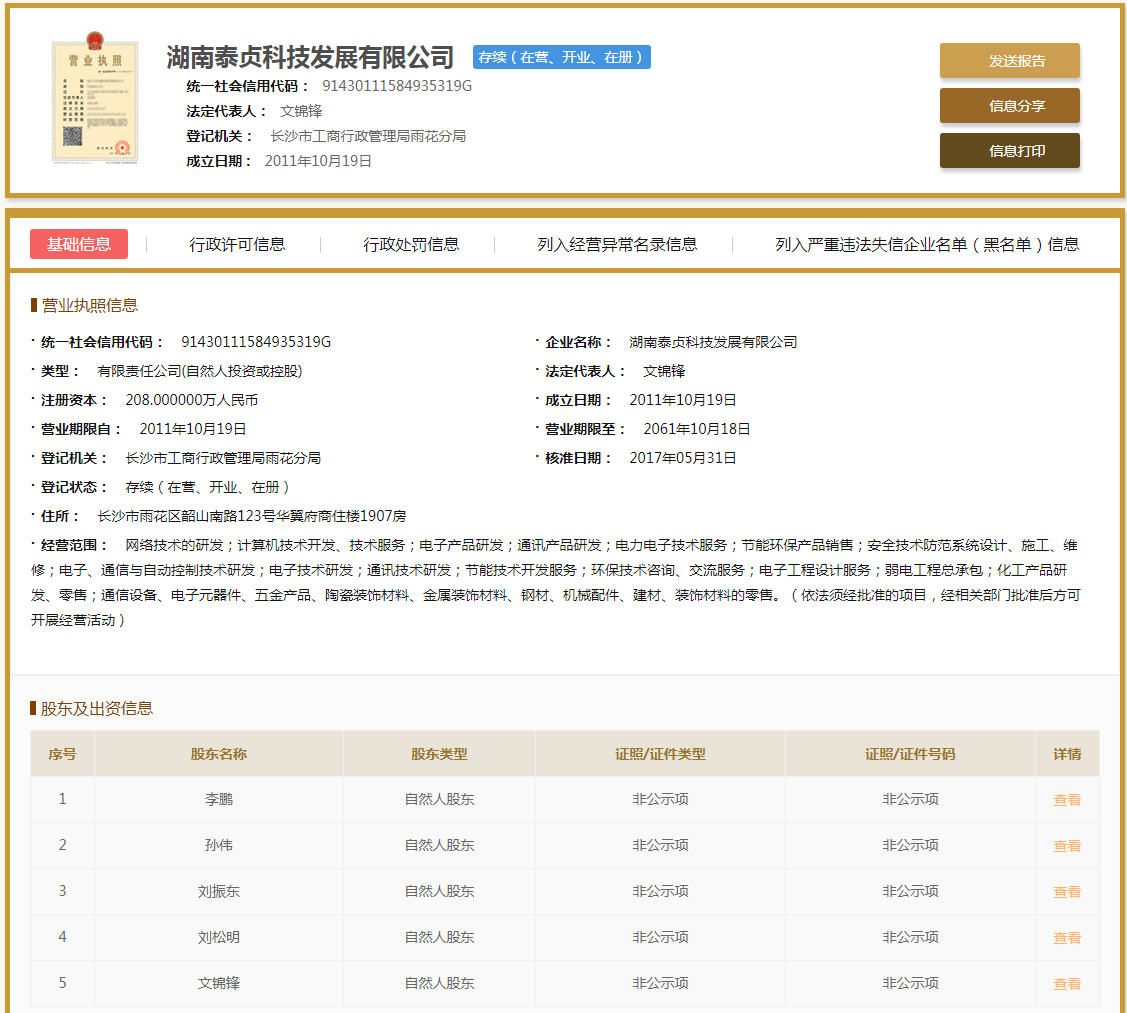 | 公司名称 | 湖南泰贞科技发展有限公司 | 信用代码 | 91430111584935319G |