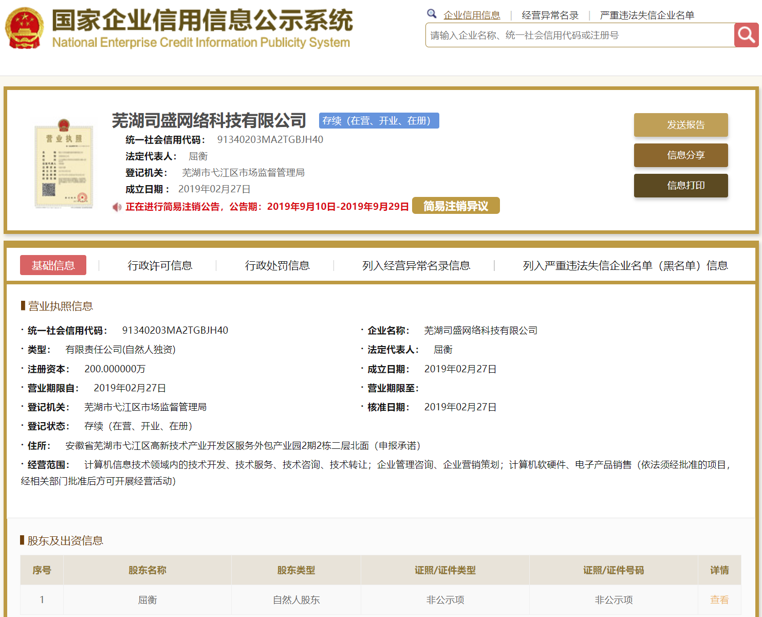 | 公司名称 | 芜湖司盛网络科技有限公司 | 信用代码 | 91340203MA2TGBJH40 |