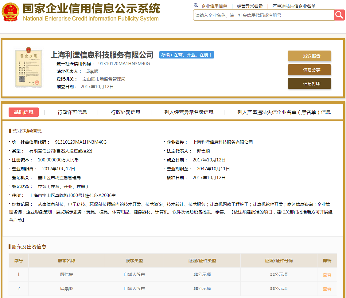 | 公司名称 | 上海利滢信息科技服务有限公司 | 信用代码 | 91310120MA1HN3M40G |