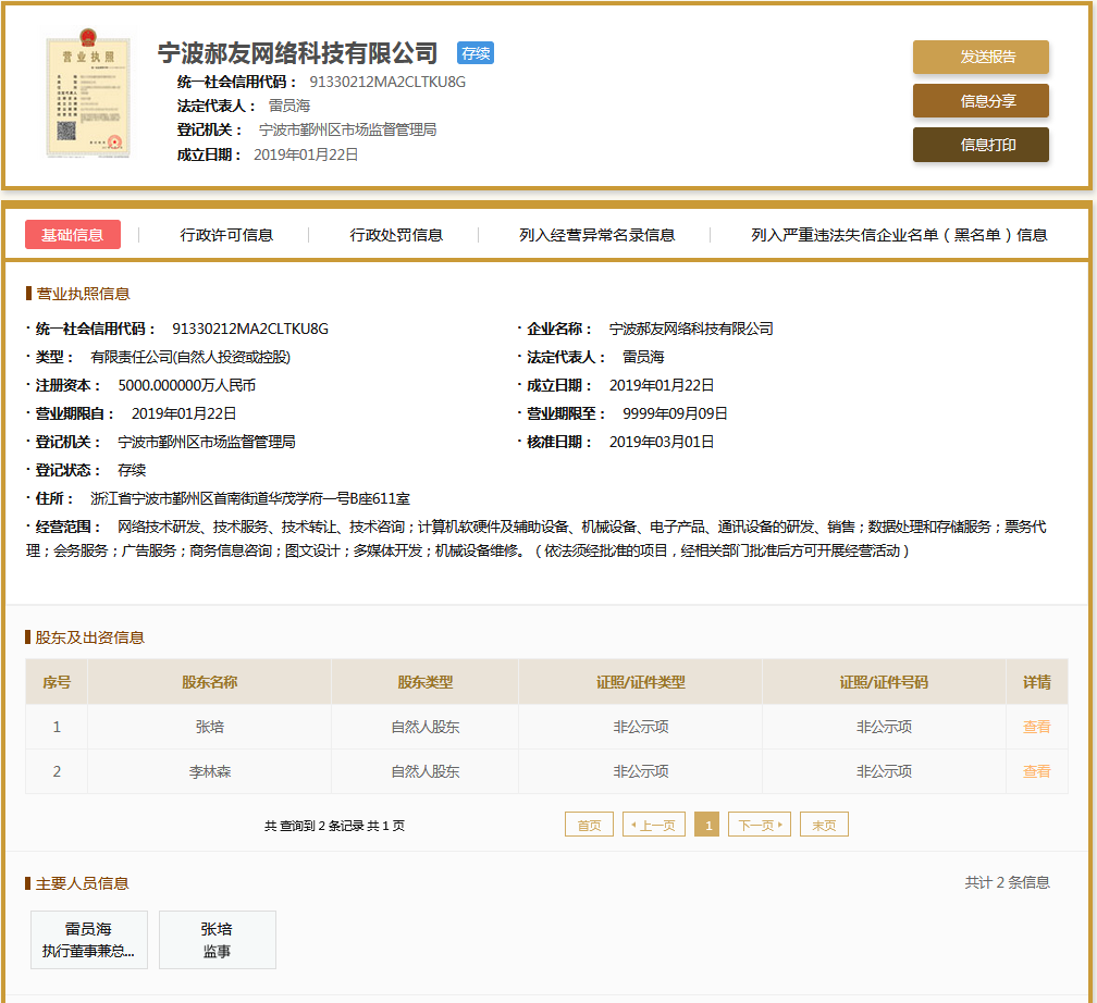 | 公司名称 | 宁波郝友网络科技有限公司 | 信用代码 | 91330212MA2CLTKU8G |