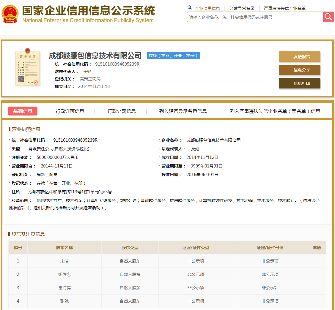 | 公司名称 | 成都鼓腰包信息技术有限公司 | 信用代码 | 91510100394605239R |