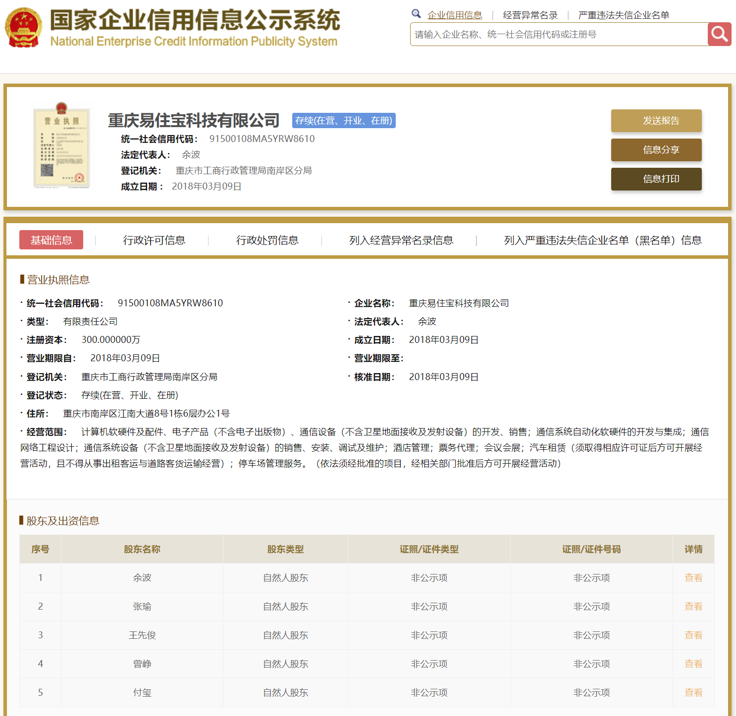 | 公司名称 | 重庆易住宝科技有限公司 | 信用代码 | 91500108MA5YRW8610 |