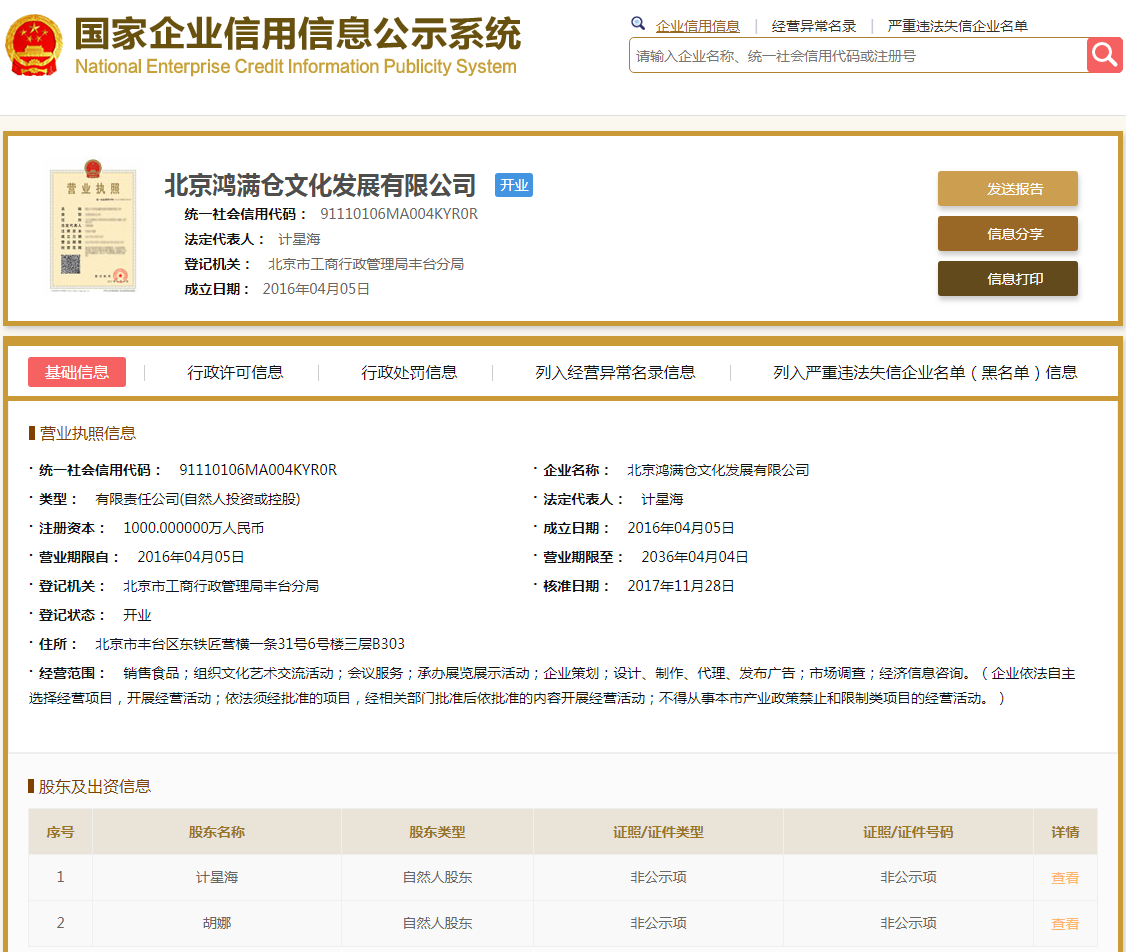 | 公司名称 | 北京鸿满仓文化发展有限公司 | 信用代码 | 91110106MA004KYR0R |