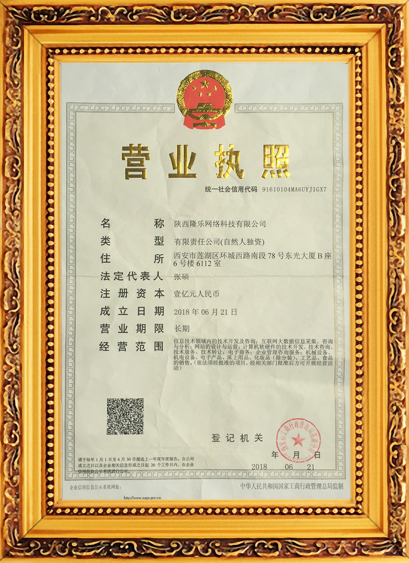 | 公司名称 | 陕西隆乐网络科技有限公司 | 信用代码 | 91610104MA6UYJ1GX7 |