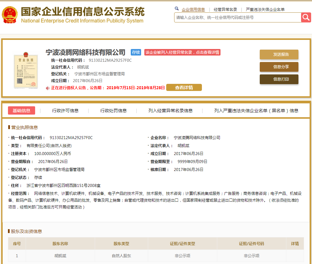 | 公司名称 | 宁波凌腾网络科技有限公司 | 信用代码 | 91330212MA29257F0C |